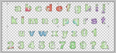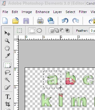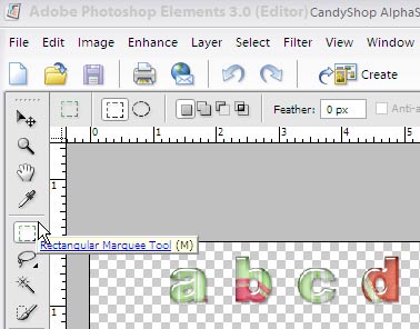 Using the Selection Tool Our new Page Pak, Candy Shop, features a bonus AlphaSet contained in one PNG file. This decreased the file size and also the number of files. For those new to digital scrapbooking, and those unfamiliar with using tools in your image editor, below is a quick tutorial using the Selection tool to copy and paste the letters/numerals you need in a layout. Note: steps shown are using Adobe Photoshop Elements 3. Other image editors would be follow similar steps. 1) Open CandyShop AlphaSet.png file (choose File>Open) from the Candy Shop Page Pak download set: