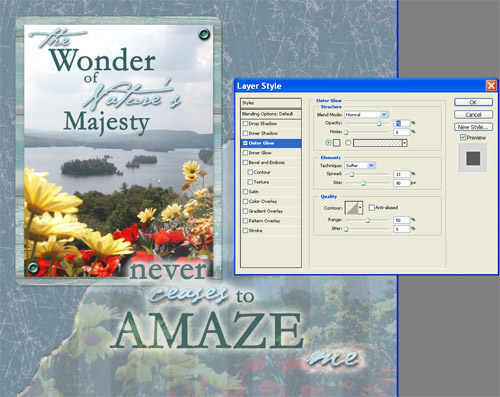 4) Border It! Add a border or a glow to your word art or title by double clicking on the layer to open the Layer Style dialog. Check either Stroke (to add a border) or Outer Glow (to add a glow). Each option will allow you to adjust the size, color, and opacity.